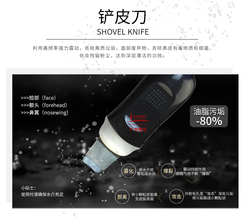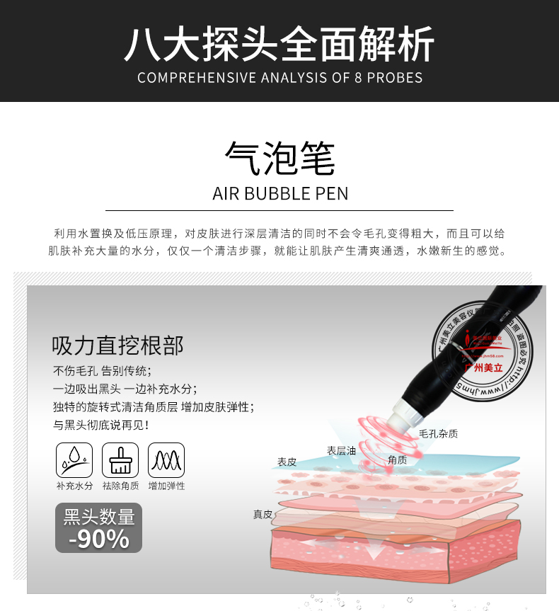大氣泡通過真空負(fù)壓形成真空回路,通過特殊設(shè)計(jì)的小螺旋吸頭用于皮膚,在安全沒有疼痛的狀態(tài)下,能深層潔面祛除老化角質(zhì),祛除皮脂黑頭清潔毛囊漏斗部的各種雜質(zhì)、螨蟲及油脂殘留物的同時(shí)使毛囊漏斗